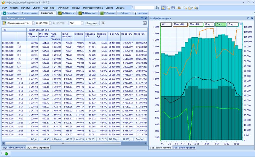 На экране отображается информация по первой ценовой зоне в почасовом разрезе. Здесь представлены две таблицы и два графика. В таблицах представлена вся информация о результатах торгов на ОРЭ по покупателям и по продавцам по первой ценовой зоне. Два стандартных графика отображают информацию по покупке и по продаже с разделением объемов на РД и РСВ.