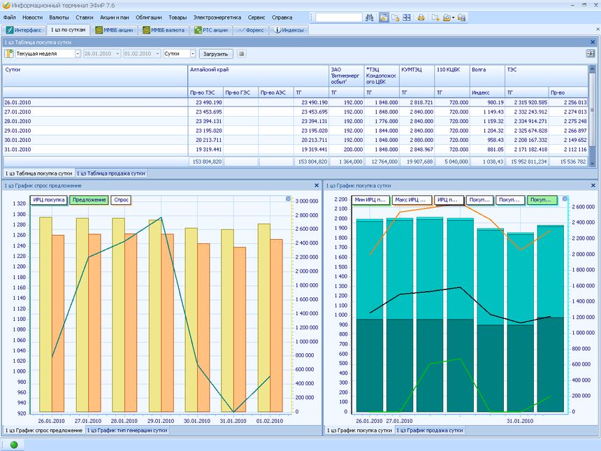 На экране отображается информация по первой ценовой зоне в посуточном разрезе. Здесь представлены две таблицы, отражающие общие результаты торгов на ОРЭ по покупателям и по продавцам. Кроме таблиц отображаются четыре графика, в которых анализируется влияние соотношения спроса и предложения на цену ОРЭ, влияние распределения генерации на цену ОРЭ, а также стандартные графики по покупке и продаже с распределением объемов на регулируемые договора и рынок на сутки вперед.