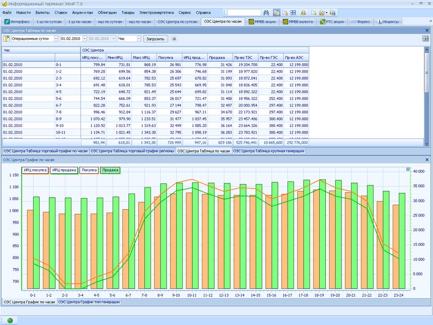 На экране отображается информация по результатам торгов на ОРЭ по ОЭС Центра в почасовом разрезе. Здесь представлены 4 таблицы и два графика.