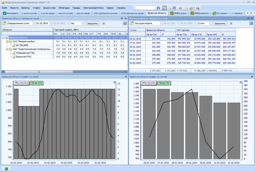 На экране отображается информация о результатах торгов на ОРЭ в Брянской области. Здесь представлены два графика и две таблицы. В таблицах отображается торговый график по станциям данного региона и распределение по типам генерации в данном регионе в сравнении с аналогичными показателями ОЭС, в которую входит регион.