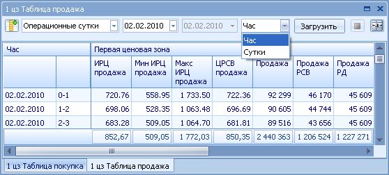 Для того чтобы изменить шаг данных (период суммирования) данных в таблицах, необходимо в Панели управления окном, располагающемся вверху таблицы, выбрать требуемый шаг данных.