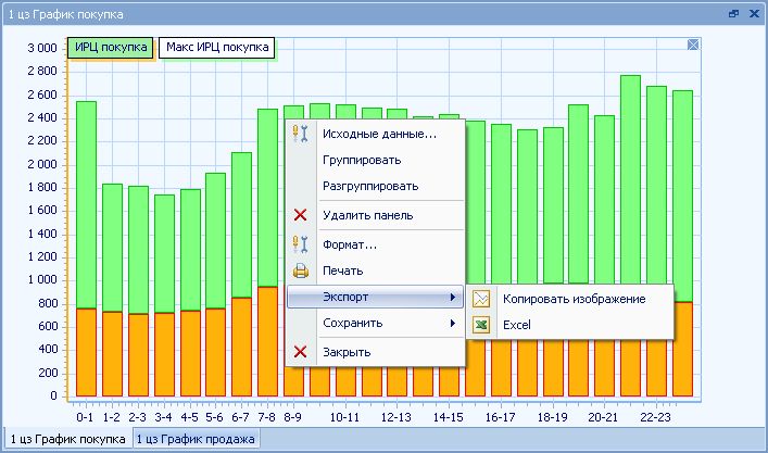 Для того чтобы экспортировать данные из графика, необходимо вызвать контекстное меню графика, нажав правой кнопкой мыши в любом месте области построения графика. Затем при помощи левой кнопки мыши в контекстном меню выбрать пункт «Экспорт», после чего откроется контекстное меню, в котором можно будет выбрать требуемый формат экспорта: «Копировать изображение» или «Excel».