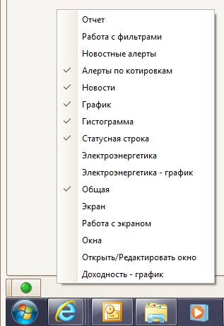Управление и функционал окон помимо контекстного меню доступен через панели управления. Чтобы отобразить панели управления на рабочем столе, необходимо кликнуть правой кнопкой мышки на верхнюю или нижнюю части экрана, откроется контекстное меню с перечнем существующих панелей управления. Проставьте или уберите галочку напротив интересующего окна, для отображения панели управления этим окном в главном меню.