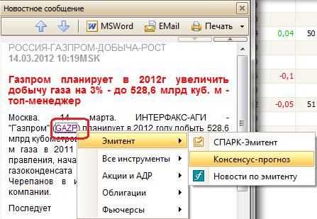 Также тест новостного сообщения привязан к тикеру инструмента, через который можно выйти на дополнительную информацию по эмитенту. Для этого кликнете левой кнопкой мыши на тикер, откроется контекстное меню, в котором можно выбрать несколько закладок: