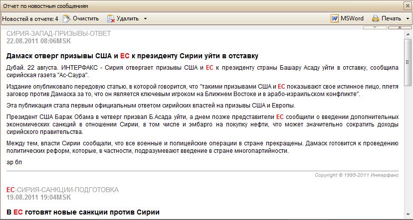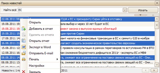 В системе существует возможность создания пользовательского отчета по новостям – документа, объединяющего несколько новостей. Пользователь может осуществить поиск новостей различными способами и добавить их в отчет, а затем отправить получившийся документ по почте, экспортировать его в Word или распечатать, как будто это одна новость.