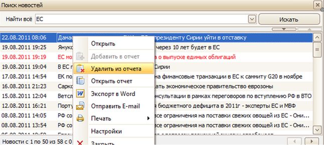 - Если новость добавлена в отчет по ошибке, то ее можно удалить. Для этого выделите заголовок данной новости в окне Поиск новостей и выберете в контекстном меню команду Удалить из отчета или нажмите кнопку