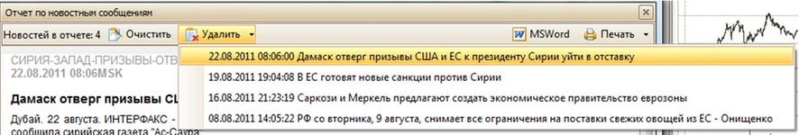 Также можно удалить ненужную новость из самого отчета. Для этого необходимо в открытом Отчете нажать на закладку Удалить и в раскрывшемся списке выбрать заголовок новости