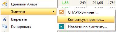 В этом разделе можно посмотреть рекомендации от ведущих инвестбанков. Для этого выделите любой инструмент и нажмите на правую кнопку мыши, откроется контекстное меню, выберите команду: Эмитент→ Консенсус-прогноз