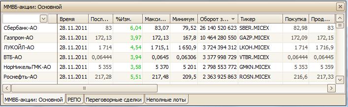 Откроется многозакладочные окно торгов на бирже ММВБ с разбивкой на субплощадки: