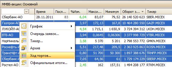 Выберите несколько инструментов (Ctrl или Shift), затем нажмите на правую кнопку мыши, вызвав контекстное меню, выберите команду Ход торгов.