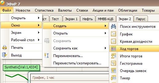 Для создания пустого окна хода торгов, выберите в главном меню программы команду Файл→Окно→Создать→Ход торгов
