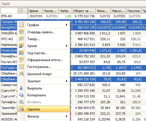 Ход торгов >> Удаление инструментов из таблицы Ход торгов