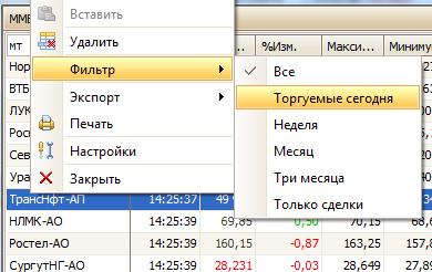 В окне ход торгов можно легко отфильтровать инструменты по заданным параметрам, для этого необходимо вызвать контекстное меню и выбрать команду Фильтр и проставить галочку. По умолчанию окно Ход торгов отображает все инструменты.