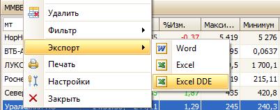 В окне ход торгов можно легко экспортировать данные по торгуемым инструментам, для этого необходимо вызвать контекстное меню и выбрать команду Экспорт. Вам будет предложено три варианта экспорта на выбор: