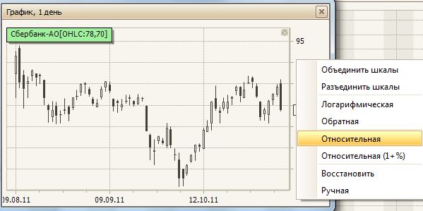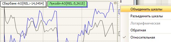 В системе существует возможность перевода шкал в относительные величины для любого инструмента и сравнения нескольких инструментов по относительной шкале. Для этого наведите курсор мышки на правую шкалу графика и вызовите контекстное меню. Выберите команду Относительная