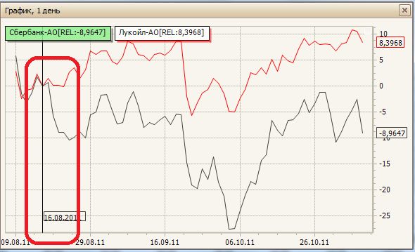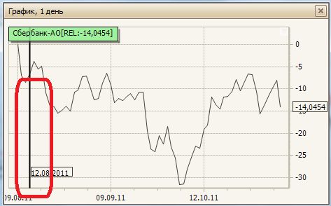 Тип графика изменится на Линию, а шкала примет величину изменений в процентах по отношению к началу графика. Чтобы изменить период определения относительного изменения Инструмента, захватите мышкой, появившуюся в конце левой части Графика вертикальную линию (линия выбора начальной даты) и переместите на интересующую дату на графике.