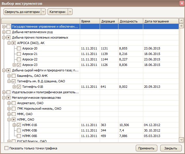 Для отображения на графике Кривая доходности, проставьте галочки на интересующих Вас инструментах и нажмите кнопку Применить.