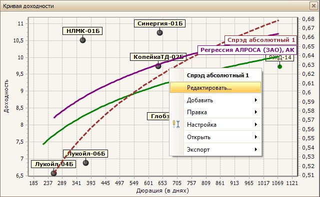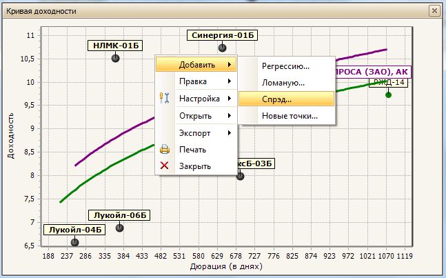 После построения 2-х и более регрессий появляется возможность для построения спрэдов. Щелкнув правой кнопкой мыши на График Кривая доходности, откроется контекстное меню. Выберите команду Добавить>Спрэд