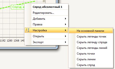 Кликнете правой кнопкой мыши на линию спрэда, при этом она будет выделена, а вместе с нею все точки и регрессии, участвующие в построении данного спрэда, откроется контекстное меню.