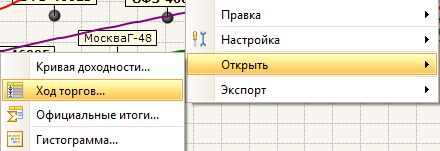 Команда Открыть - дает возможность открыть новые окна (Кривая доходности, Ход торгов, Офиц.итоги, Гистограмма) сразу по всем инструментам участвующим в построении данной спрэда