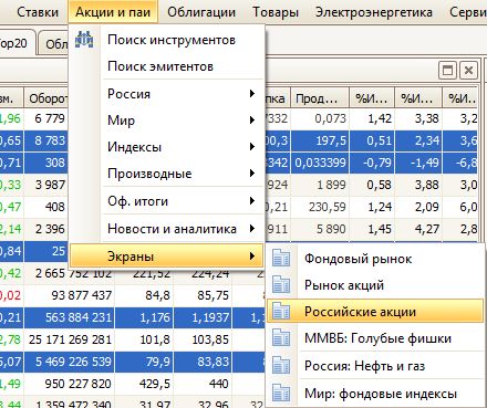 В терминале ЭФИР есть возможность использовать уже преднастроенные экраны по интересующей тематике финансовых рынков. Для этого через главное меню надо открыть нужный раздел (например Акции) и внизу открывшегося меню выбрать команду Экраны: