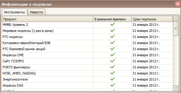 Чтобы узнать перечнь своей подписки выберите в главном меню раздел: Справка→Моя подписка. Откроется окно Информация о подписке, в котором будет две закладки Инструменты и Новости с перечнем источников и датой окончания подписки.