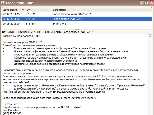 Для прсмотра Архива сообщений, следует в главном меню выбрать команду Справка→Сообщения ЭФИР. Откроется окно с перечнем последних системных сообщений.