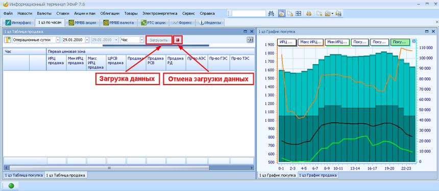 Информация на всех стандартных экранах представлена в виде таблиц и графиков. Графики загружаются автоматически при открытии экрана, а таблицы – пустыми. Чтобы просмотреть информацию в таблице, необходимо нажать кнопку